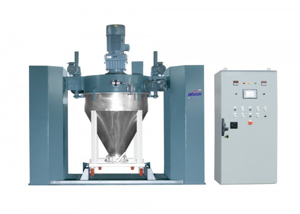 MIC系列混合機是料斗循環可移動式混合機,整個工作用可編程控制器PLC自動控制。裝有原料料斗推上工位后,控制系統自動提升并與攪拌頭結合鎖緊。然后料斗與攪拌頭一起不同角度翻轉,在翻轉過程中對原料進行混合。